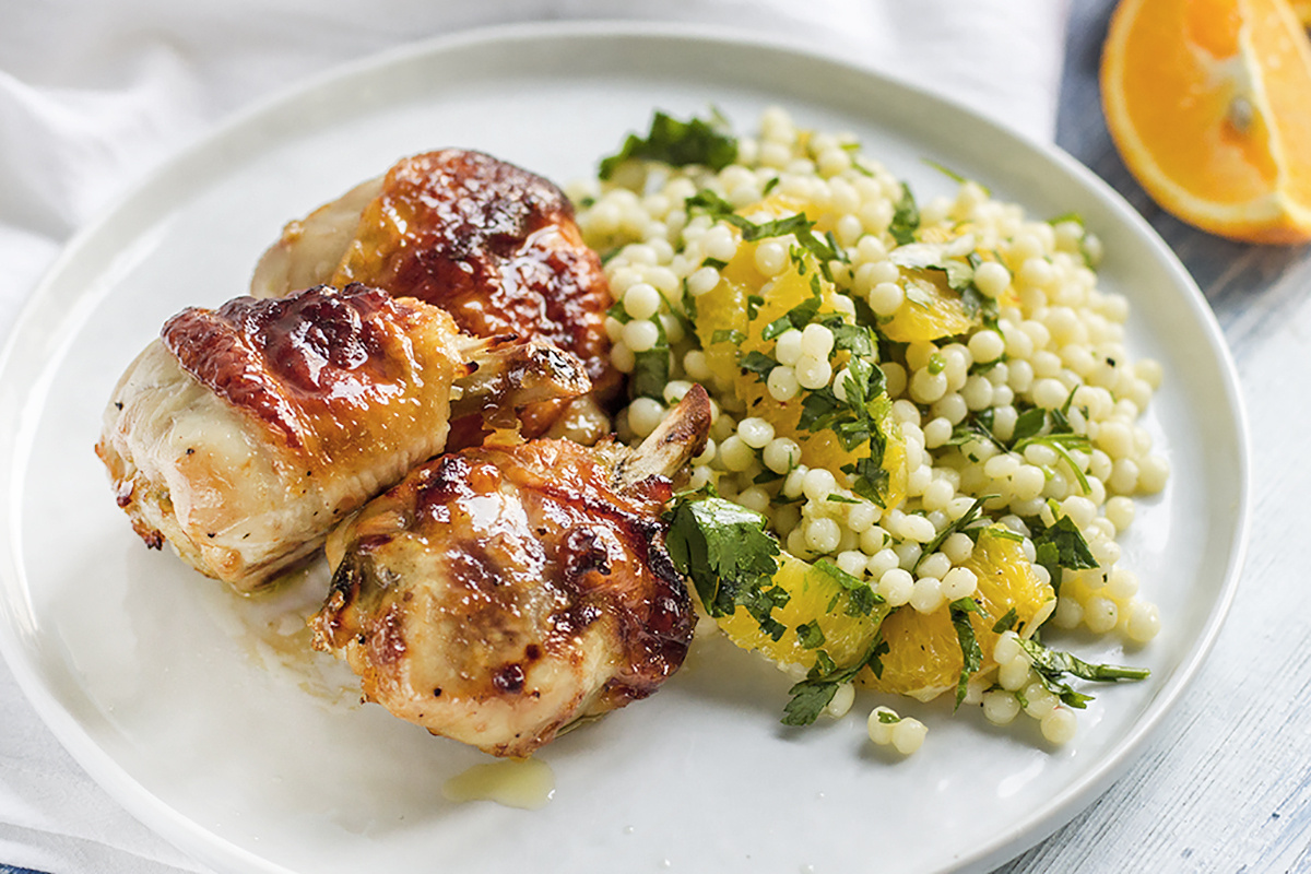На тарелке сервируйте птитим и запечённого цыплёнка. Подавайте горячим и наслаждайтесь!