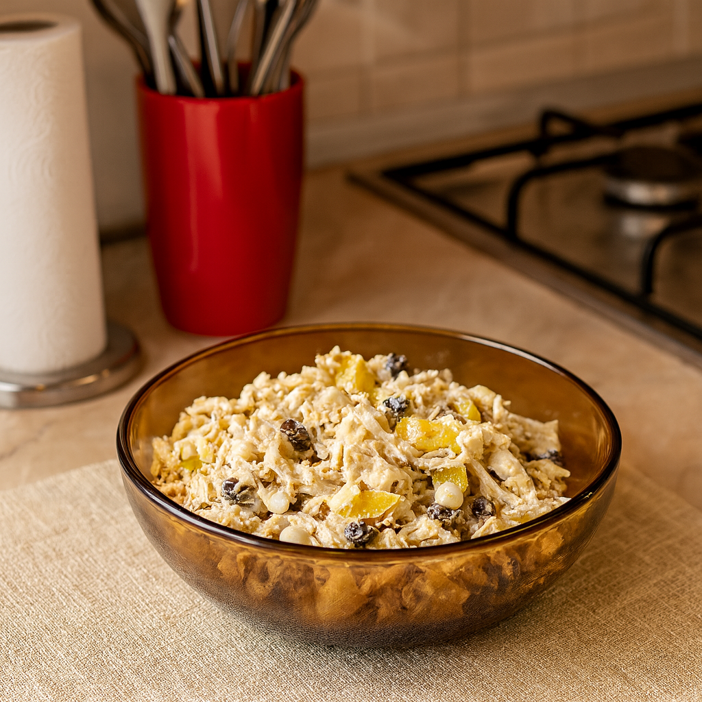 Лёгкий майонез связывает все текстуры; если предпочитаете, замените на густой йогурт. Соли немного: иногда сыра и курицы достаточно. Маленькая щепотка соли творит чудеса — как щепотка сахара в помидорах летом.