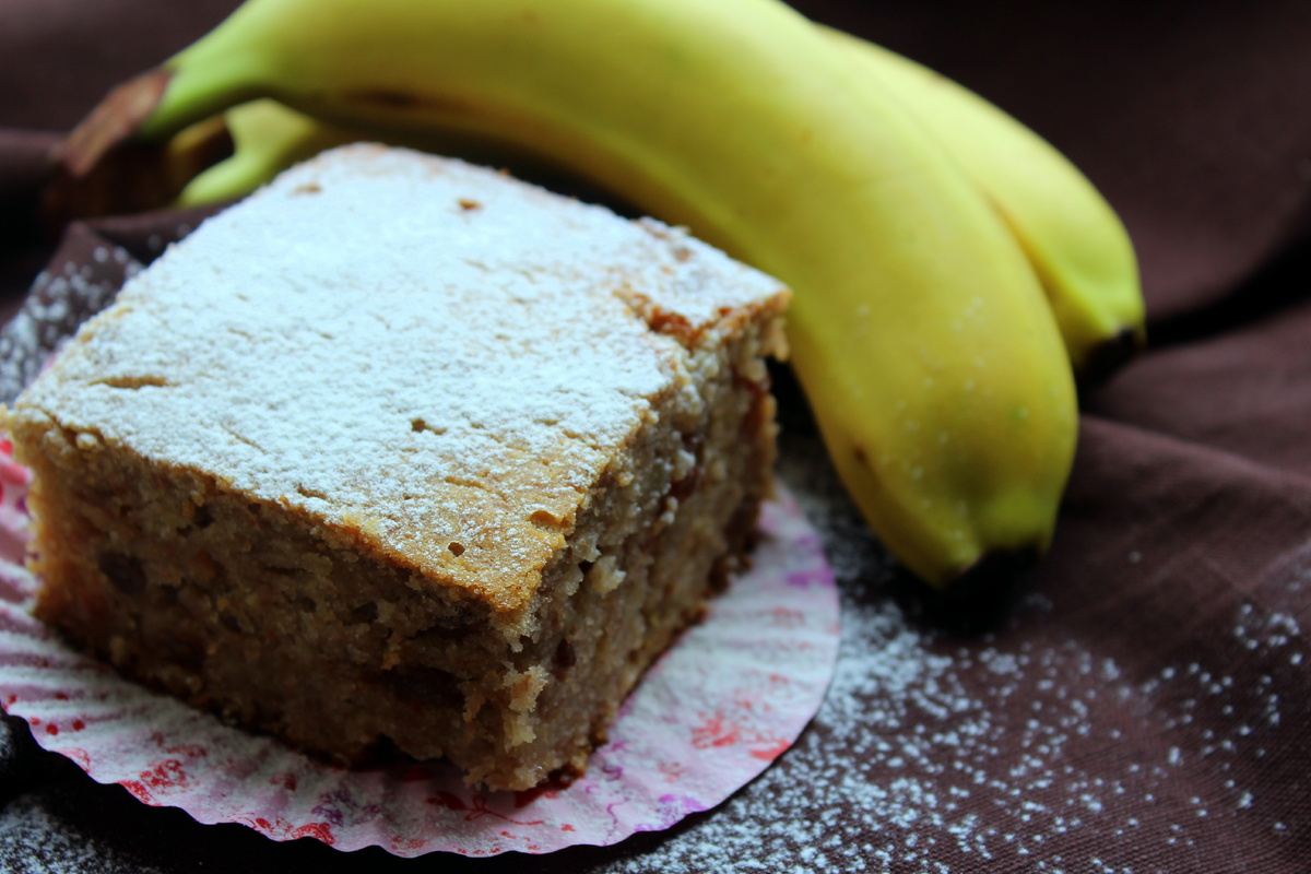 В процессе выпечки кухню наполняет аппетитный аромат сладких бананов. Не беспокойтесь о внешнем виде кекса, потемнение бананов в тесте на вкус не повлияет!