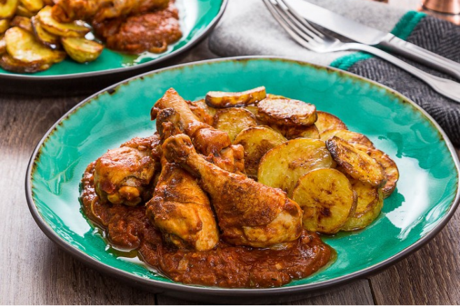 Шаг 7: Время сервировать! Разложите запечённый картофель по тарелкам, а рядом красиво выложите куриные ножки в ароматном томатном соусе. Приятного аппетита!