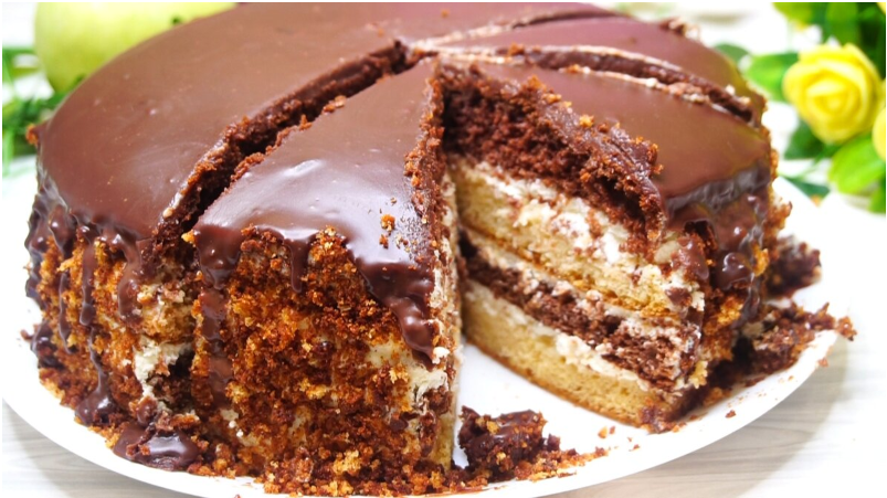 Когда коржи остыли, их следует аккуратно разрезать пополам, чтобы получить четыре коржа. Начинаем сборку: каждый корж пропитываем и смазываем кремом. Обмазываем бока, а решётки от обрезков насмаливаем сверху. Завершаем глазурью и оставляем пропитаться.