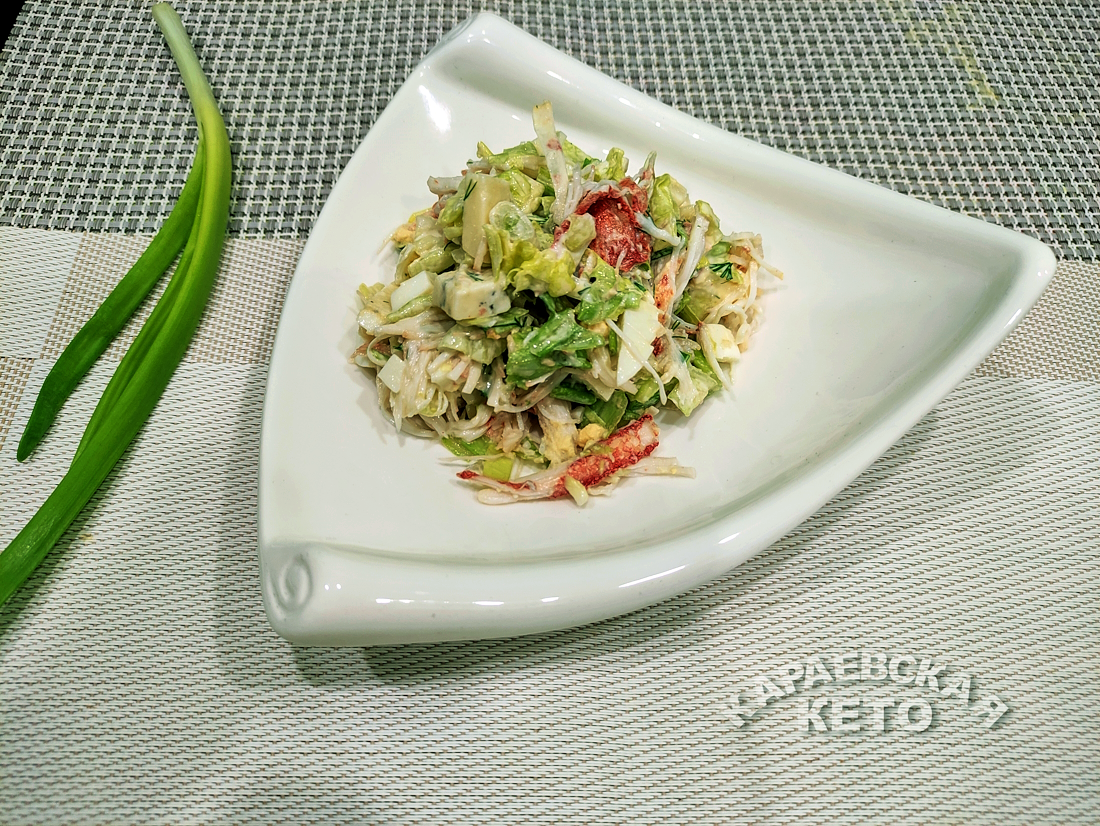 Приготовление этого вкусного салата займет всего несколько минут. В салатник необходимо выложить мясо краба, а яйца мелко нарезать. Сыр следует нарезать кубиками, а салат айсберг — тоже мелко нарезать. Все ингредиенты тщательно перемешиваются с зеленью, солятся и заправляются майонезом. Наслаждение гарантировано!