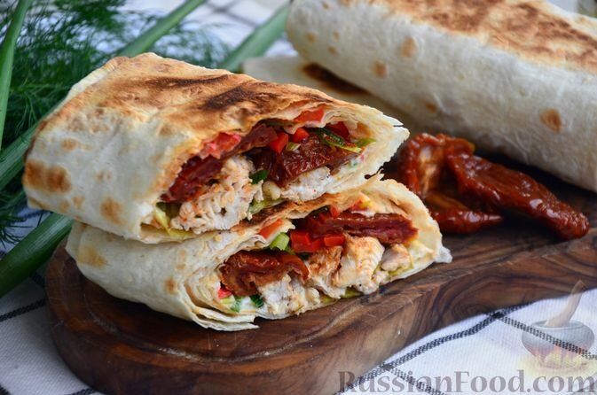 Шаурма с курицей и вялеными томатами. Эта комбинация тонкого лаваша, куриного филе и свежих овощей становится особенно интересной, если добавить вяленые помидоры. Их насыщенный вкус и аромат придадут блюду уникальность.