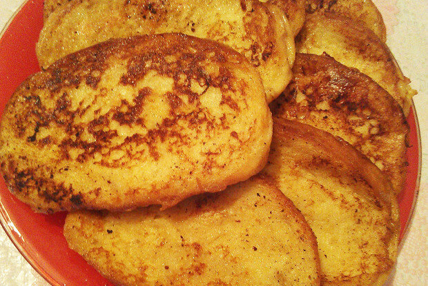 - Нарезка и пропитка хлеба: Возьмите свежий батон и нарежьте его на ломтики. Затем пропитайте каждый кусочек получившейся яично-молочной смесью.