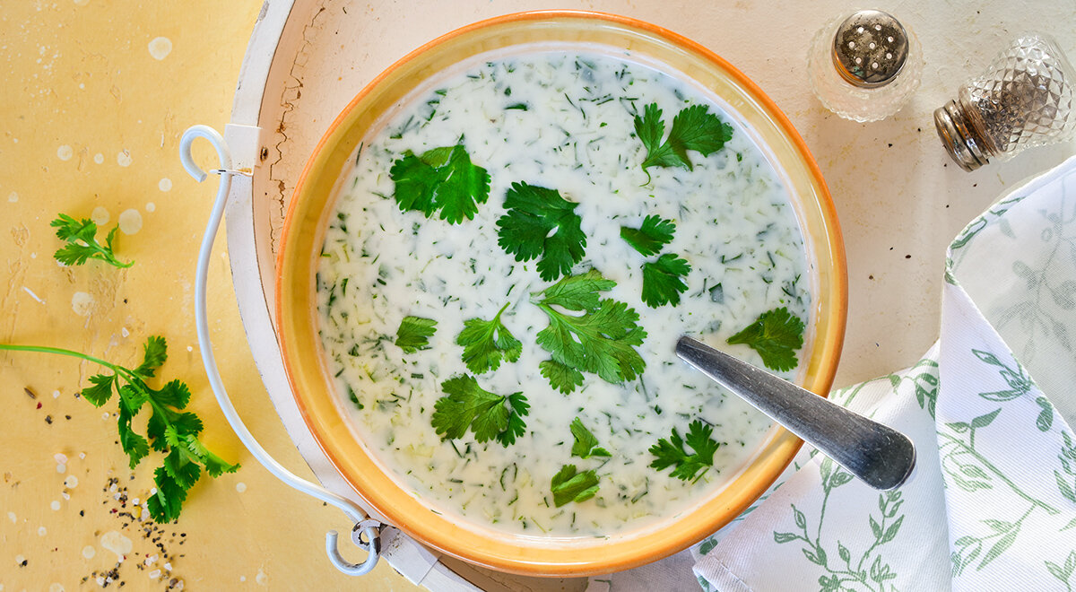 Несмотря на то, что окрошка имеет статус супа, ее обычно подают в стаканах или кружках. Основой послужит густой армянский мацун (или мацони), который разбавляется холодной минералкой для достижения нужной консистенции. В большинстве традиционных рецептов присутствуют свежие огурцы, а для сытности можно добавлять кусочки подсушенного лаваша. Выбор зелени огромен: кинза часто смешивается с укропом, петрушкой, зеленым луком, базиликом и даже мятой.
