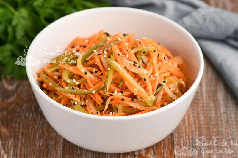Морковь нарезается тонкой соломкой и слегка мнется с солью. Огурцы нарезаются и добавляются к моркови, затем к овощам присоединяются полукольца лука. Заправка из чеснока, специй, горчицы и меда придаст блюду особый вкус. После заправки настойка в холодильнике на 20-30 минут улучшит вкус и текстуру салата. По желанию его можно посыпать семенами кунжута перед подачей.