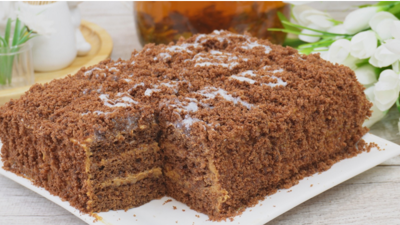 6. Украсить можно крошками, оставшимися от обрезков коржа. Для дополнительной сладости поливают торт сгущенным молоком.