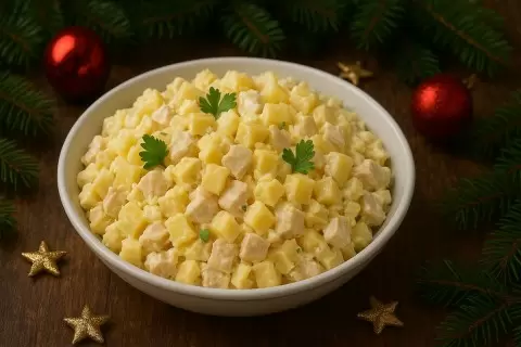 1. Классический салат с курицей, ананасом и сыром
