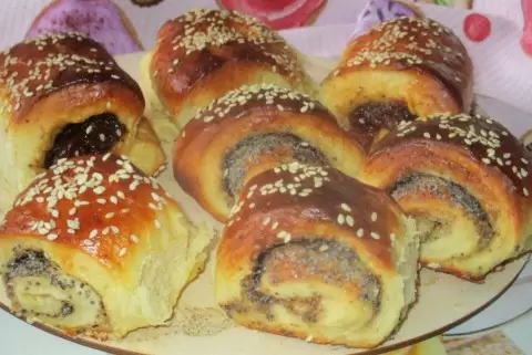Тесто делится на две части. Первая часть раскатывается, на нее выкладываются корица и сахар. Затем добавляется мак, после чего тесто скручивается в рулет и нарезается на небольшие кусочки. Вторая часть теста предназначена для рулетиков с яблочным повидлом. Начинка равномерно распределяется по тесту, которое также сворачивается в большой рулет и нарезается на кусочки.