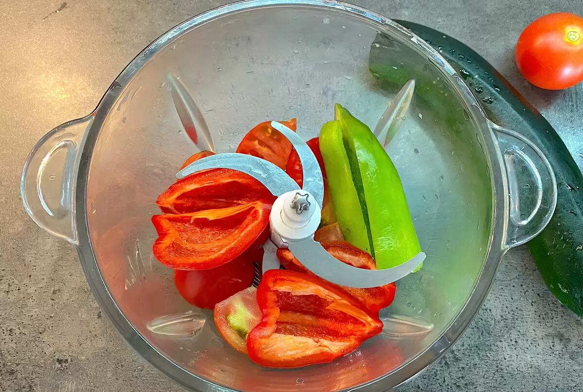 Первым делом овощи тщательно промываются и очищаются. После этого помидоры и сладкий перец помещаются в чашу блендера. Далее добавляем кабачок, лук и чеснок, и все это измельчаем до получения однородной массы. Смесь следует выложить в кастрюлю с толстым дном, добавить соль и перец.