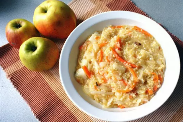 Пшено тщательно промыть, картофель и топинамбур нарезать кубиками, репу – мелкой соломкой, морковь – крупной. Лук следует нарезать полукольцами, а чеснок – мелко.В кастрюле довести воду до кипения и добавить картофель, топинамбур и лавровый лист. Через 3-5 минут ввести пшено, уменьшить огонь и готовить на медленном огне.Тем временем на сковороде обжарить лук с морковью и чесноком на сильном огне. Через некоторое время добавить немного репы, затем квашеную капусту и уменьшить огонь. Когда картофель почти готов, объединить обе смеси. Овощи должны тушиться 10-15 минут, затем добавить натертое кисло-сладкое яблоко и продолжать варить до мягкости капусты.В завершение ввести мелко нарезанную зелень, толченое сало с чесноком, посолить и поперчить по вкусу. Дать настояться под крышкой 10-15 минут перед подачей, заправляя растительным маслом.Не забудьте поделиться этим рецептом с друзьями и наслаждаться вкусом домашней кухни вместе с ними!