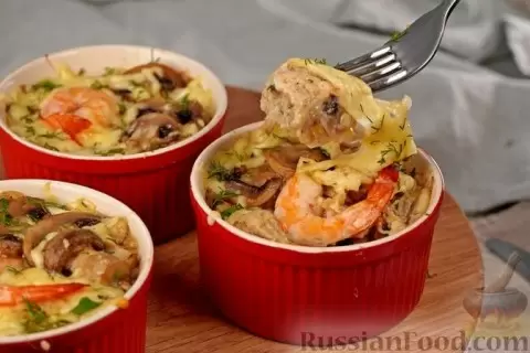 - Жюльен с креветками и грибами: Невероятное сочетание морепродуктов и грибов, пропитанных сливками и нежным сыром. Это блюдо станет настоящим хитом на любом столе.