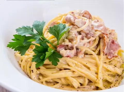 Шаг 6: Разделите яйца на белки и желтки, белки не понадобятся. Введите желтки в сковороду со спагетти, перемешайте и прогрейте 30 секунд, затем добавьте рубленую петрушку, перемешайте и снимите с огня.