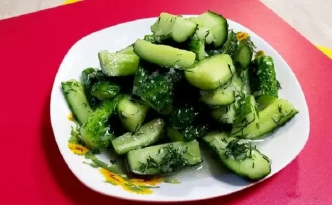 4. Оставить смесь в холодильнике на 10 минут. За это время огурцы впитают ароматы, станут сочными и хрустящими. По мере настаивания вкус будет становиться ярче и насыщеннее.