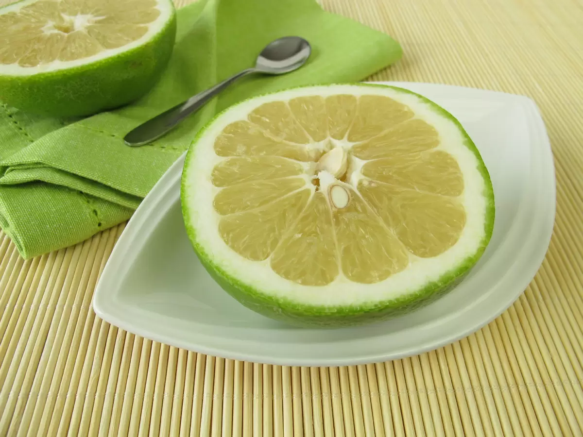Свити — это гибрид сладкого помело и грейпфрута. По форме он напоминает последний, но его выделяет толстая зеленая кожура, сохраняющая яркий цвет даже при полном созревании. Плоды достигают 10-12 см в диаметре и весят около 300 г. Внутри находятся 10-14 сочных долек с нежной бледно-желтой мякотью. Свити сочетает сладость грейпфрута с цветочным ароматом, что делает его настоящим деликатесом.
