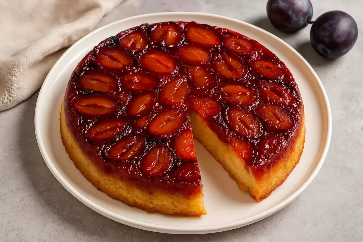 - Эстетическая подача. При перевороте пирога на тарелке проявляется красота карамели со сливами, которая приятно удивляет всех.