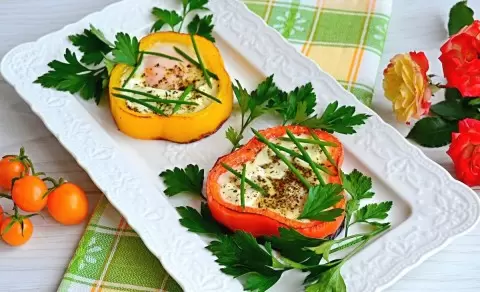 Яичница в болгарском перце оформляется свежей зеленью перед подачей на стол. Это блюдо не только вкусное, но и весьма презентабельное, поэтому порадуйте свои близкие удивительным завтраком или легким новым обедом!