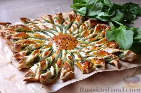 Этот закусочный пирог выглядит как настоящее кулинарное произведение искусства и при этом готовится несложно. Использование готового слоёного теста позволяет значительно сократить время на приготовление. Яркие лучики пирога, наполненные шпинатом и фетой, приятно удивят гостей, ведь угощение выглядит так оригинально, что не требует дополнительных украшений.