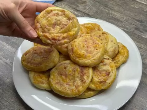 На первый пласт теста равномерно выкладывается половина натертой ветчины и сыра, а также половина от общего количества сливочного масла для добавления сочности и аромата. Затем тесто аккуратно сворачивается в рулет, после чего нарезается на 8 равных частей, которые слегка расплющиваются и выкладываются на противень, застеленный пергаментной бумагой.