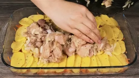 Настало время собрать блюдо! Жаропрочную форму смазываем маслом. На дно укладываем половину куриного филе с луком, затем половину натертой моркови, а после – половину картофеля. Повторяем слои: снова курица, морковь и картошка.
