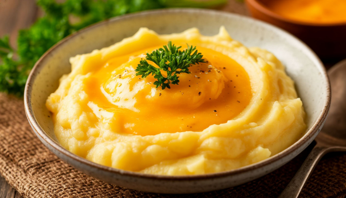 Размять картофель до состояния однородного пюре, лучше всего использовав пресс или сито — блендер может испортить текстуру. В отдельной кастрюле следует подогреть сливки, молоко и сливочное масло, по желанию добавив раздавленный зубчик чеснока для аромата. После этого горячую жидкость вливают в пюре и тщательно перемешивают до получения кремовой массы. Обязательно посолите по вкусу.