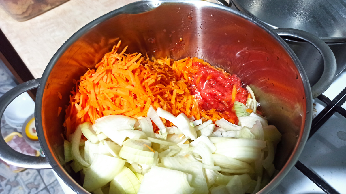 1. В глубокой кастрюле разогрейте растительное масло, добавив туда измельченные в блендере томаты, нарезанный кубиками лук и болгарский перец. Периодически помешивая, тушите овощи на среднем огне около 15 минут.