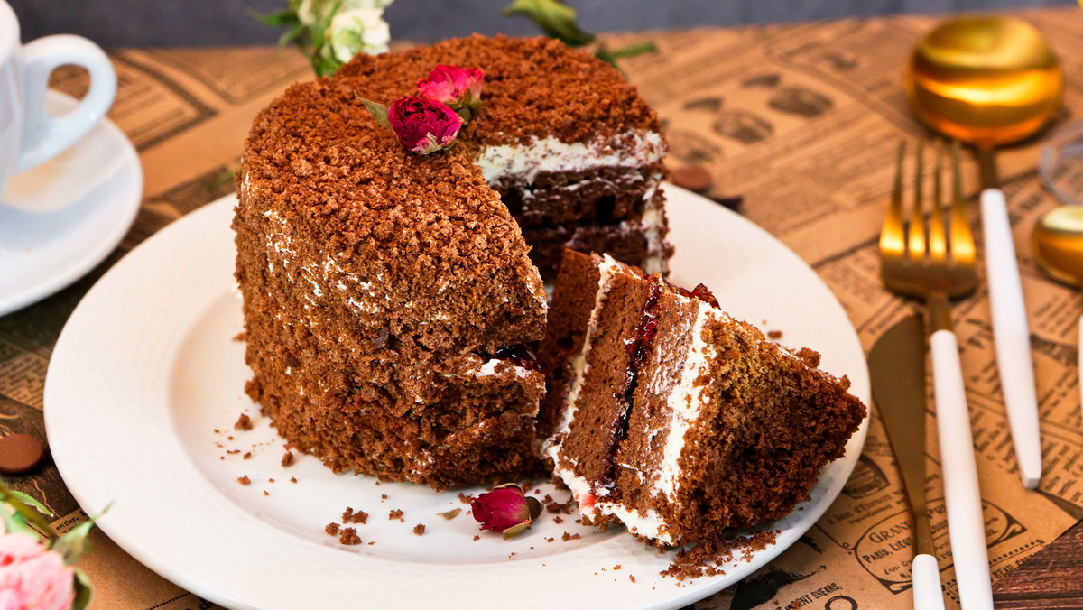 Обрезки бисквита измельчить в крошку и обсыпать ими стороны торта, равномерно распределяя. В завершение украсть десерт сухими розами. Дать настояться в холодильнике на протяжении 4 часов перед подачей. Приятного аппетита!