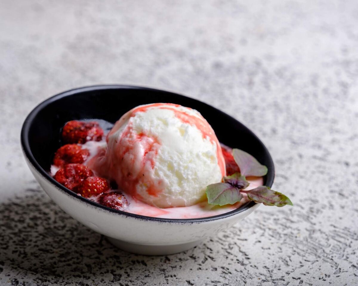 Шаг 4: Если соус планируется использовать для мороженого, на этом этапе можно остановиться. Просто выложить шарик мороженого в креманку и полить его свежеприготовленным соусом. По желанию, украсить блюдо листиком базилика.