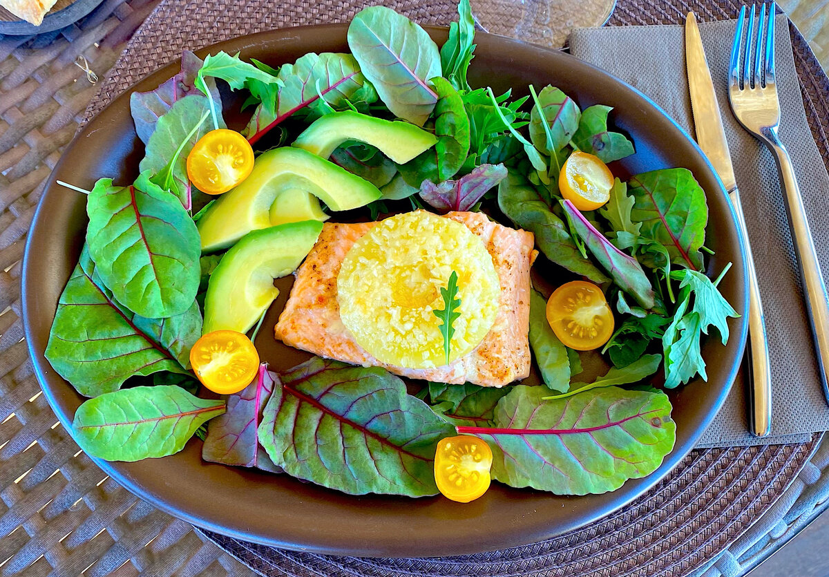 На сервировочное блюдо выкладываем свежий микс салатных листьев, затем аккуратно помещаем куски рыбы, добавляя на гарнир авокадо и помидоры. Для завершения можно добавить немного лимонного сока и оливкового масла.