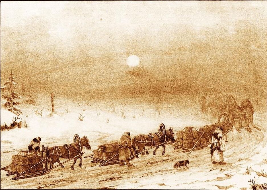 Талантливый художник Павел Михайлович Кошаров переехал в Томск в 1854 году и известен своими «Художественно-этнографическими рисунками Сибири», среди которых есть работы, посвященные зимним перевозкам чая.
