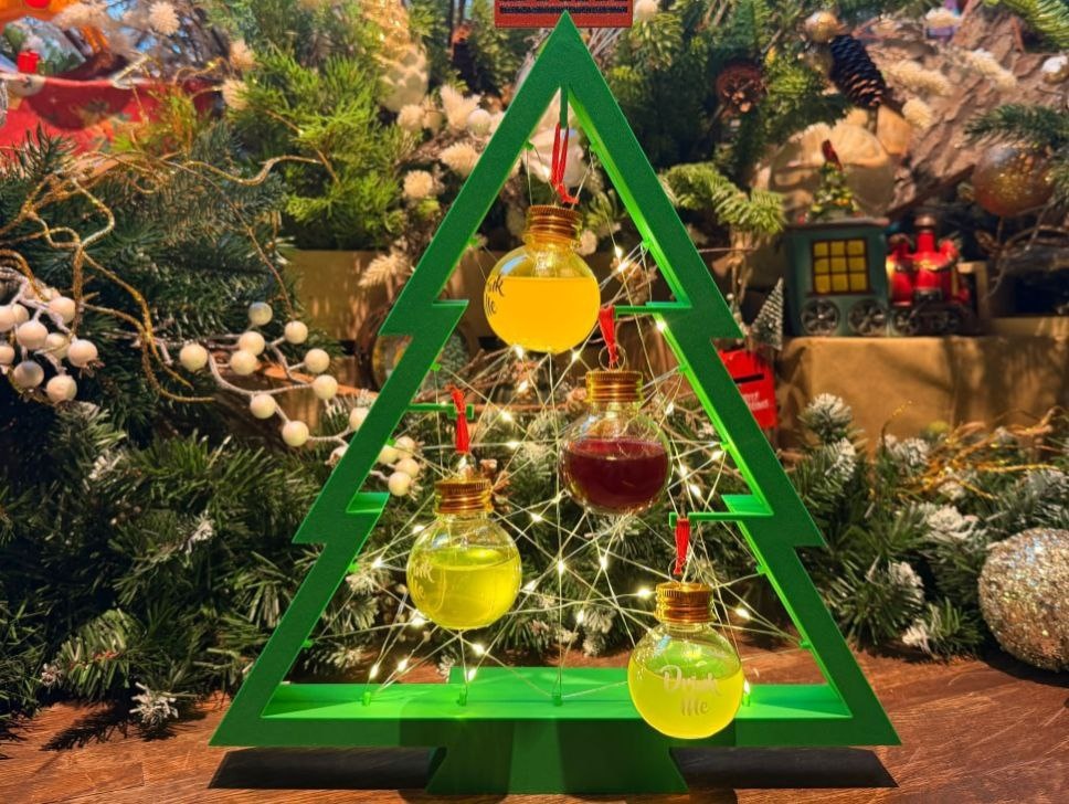Новогодняя алко-елка — это не просто украшение, а уникальный коктейльный опыт. Вместо традиционных шаров на ней расположены четыре авторские настойки на основе чачи, каждая из которых предлагает неповторимый вкус: