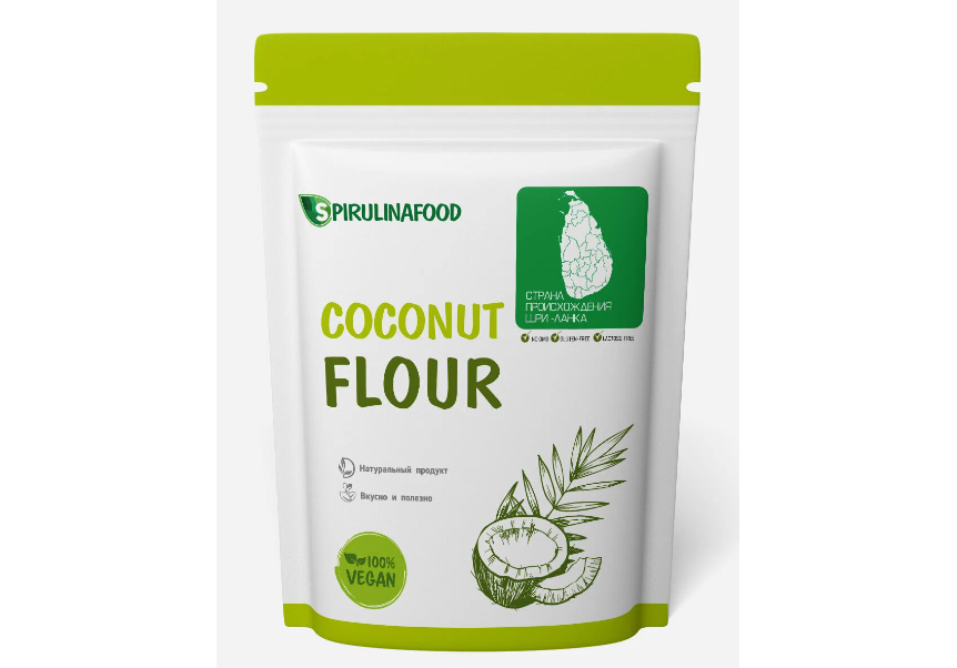 - Кокосовая мука SpirulinaFood: Основной выбор для выпечки. У нее всего 16 г углеводов на 100 г, что гораздо ниже, чем у многих аналогов. К тому же, она без глютена.