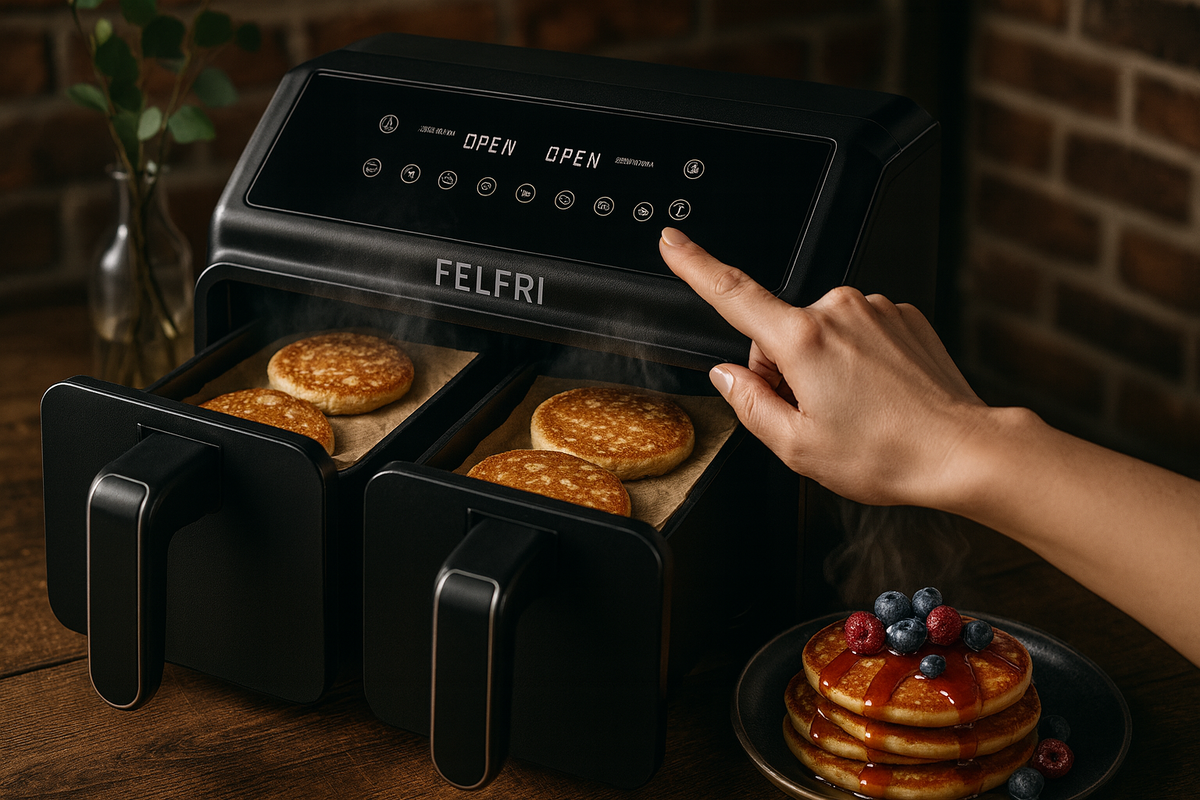 Аэрогриль FELFRI FF-AF-01 обладает объёмом в 9 литров и мощностью 3000 Вт, что обеспечивает быструю подготовку и стабильное поддержание температуры. Удобное сенсорное управление и антипригарное покрытие делают его идеальным для приготовления не только оладий, но и сырников или запеканок. Две чаши позволяют одновременно запекать и подогревать блюда.