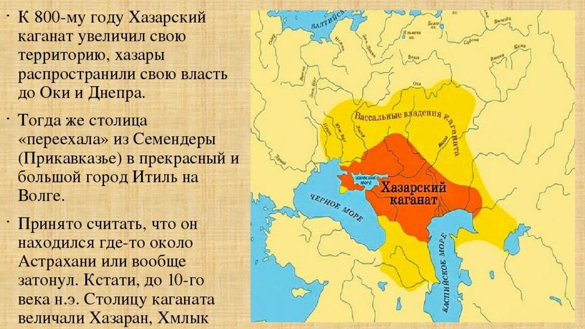 Название Хазарского моря восходит к древнему народу хазар. Важный исторический факт: в различные эпохи Хазарским морем называли не только Каспий, но и Черное и Азовское моря. Эти названия отражают могущество Хазарского каганата и его значительное присутствие на морях, включая развитие хазарского флота. Столицей Хазарии был Итиль, расположенный в устье Волги, который стал важным торговым узлом.