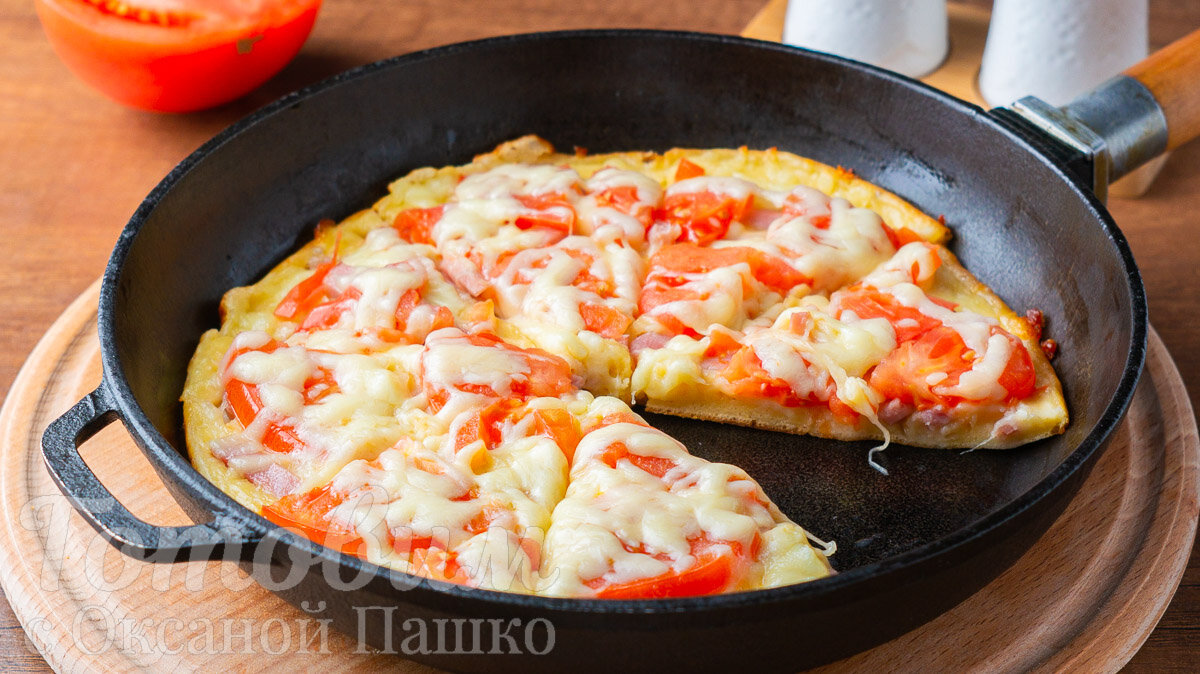 Эта пицца на сковороде выходит действительно вкусной и сытной. Если дома маловато времени на сложные рецепты, то данный способ приготовления пиццы — настоятельно рекомендуется!