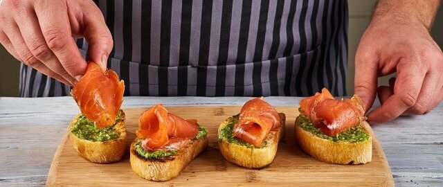 1. Нарежьте чиабатту на ломтики толщиной около одного сантиметра. Помидоры также порежьте тонкими кружками, а рыбу — на пластины. В этом моменте потребуется помощь — нарезка рыбы может быть деликатным процессом!