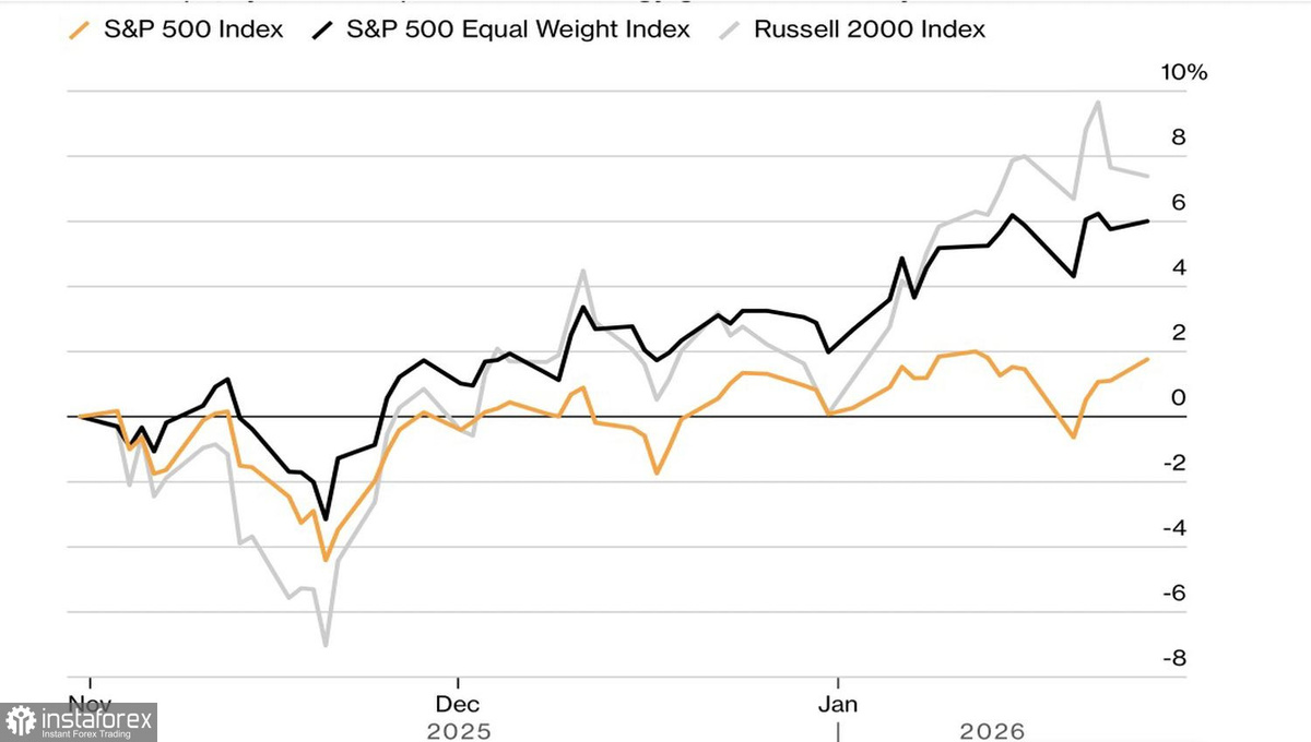 Вопрос, который волнует инвесторов: смогут ли крупные технологические компании оправдать колоссальные вложения в искусственный интеллект? Если да, то ротация активов может столкнуться с трудностями. В противном случае отток капитала в компании с малой капитализацией возобновится. По оценкам Morgan Stanley, циклические акции забрали лидерство у технологических компаний благодаря лучшим фундаментальным оценкам и способности генерировать прибыль. Ожидается, что Russell 2000 вырастет на 13,5% в 2026 году, тогда как S&P 500 — на 12,8%.