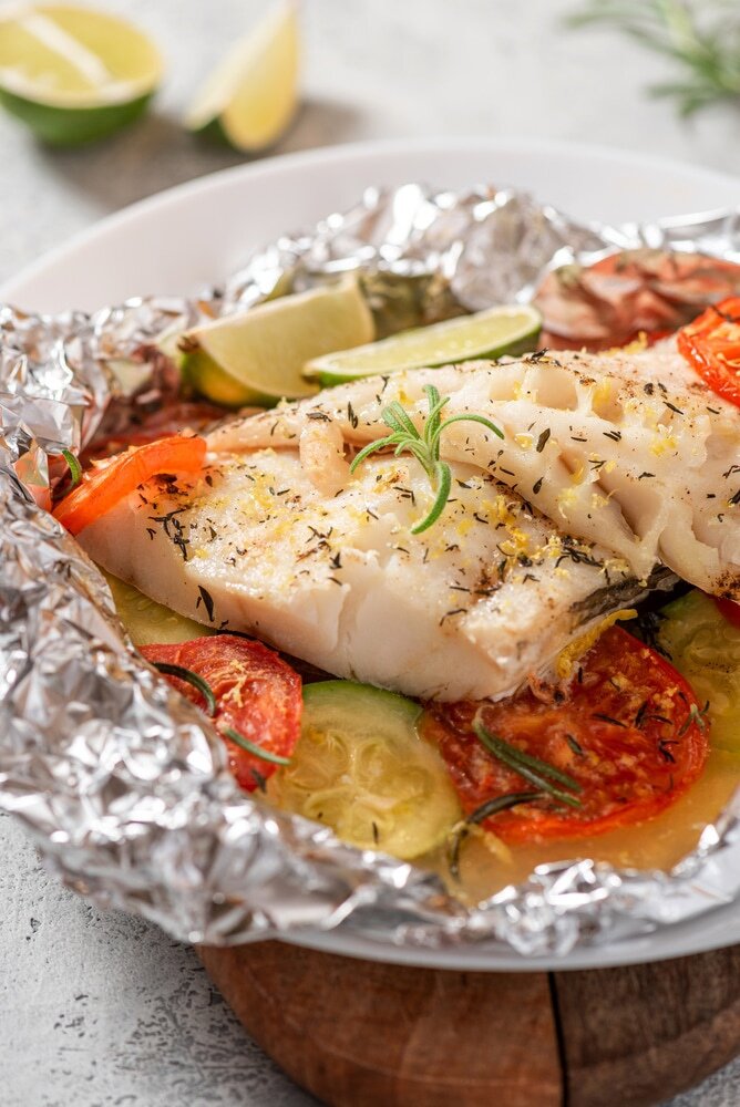 Рыбу также приправьте тимьяном, розмарином, солью и перцем, а также цедрой цитрусовых. Уложите рыбу поверх овощей, а потом заверните фольгу так, чтобы не осталось дырок.