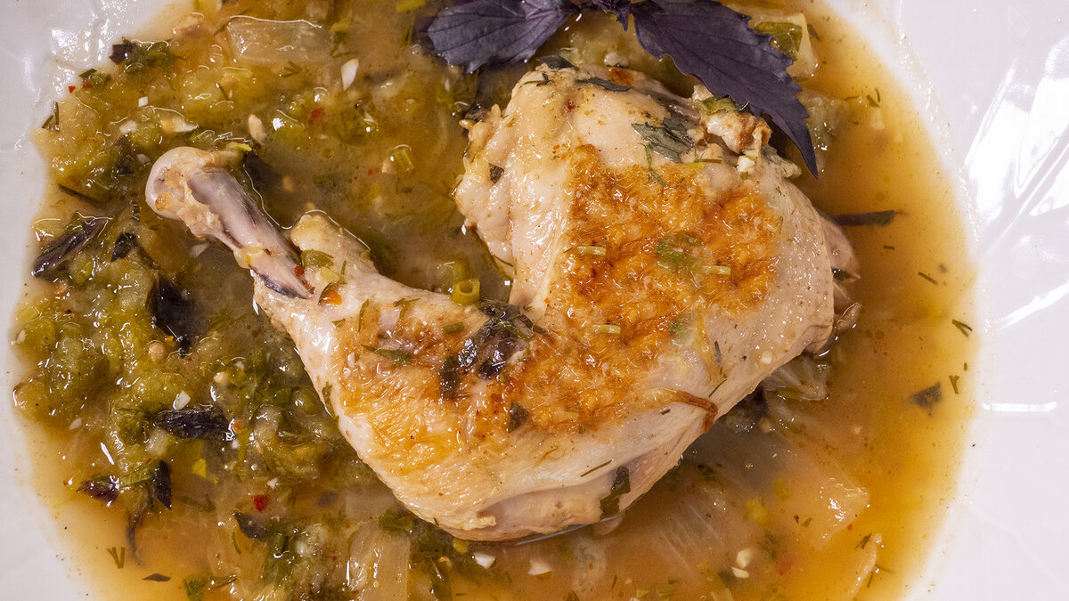 Завершая, чеснок и зелени — красный базилик, укроп, кинзу и зеленый лук — мелко нарезаются и посыпаются сверху чахохбили. Если нужно добавить кислинки, можно включить чайную ложку 9% уксуса. Дайте блюду настояться под крышкой в течение 30 минут, чтобы все ароматы как следует слились.