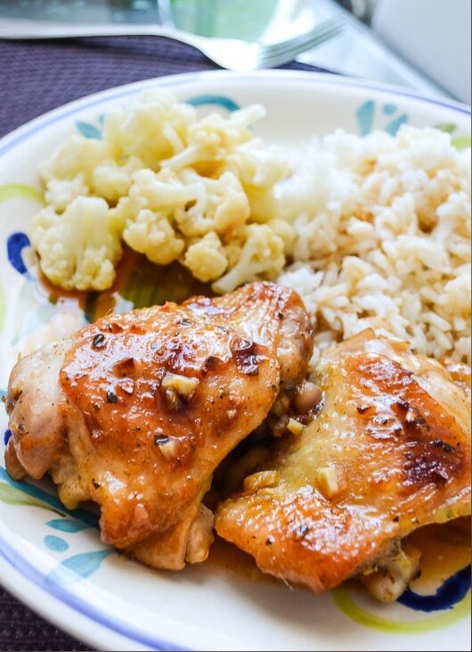 Пока курица маринуется, приготовьте гарнир. Отличным вариантом будут отварной рис и запеченная цветная капуста со сливочным маслом.