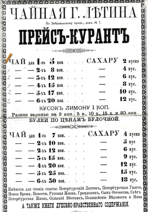 Кроме того, формулировка «Кусок лимону» вызывает улыбку и непременно должна произноситься с особым акцентом при заказе. Но нельзя не заметить и примечательный раздел в нижней части прейскуранта, где представлен список газет для чтения. Он завершается выразительной строчкой: «А также книги духовно-нравственного содержания».