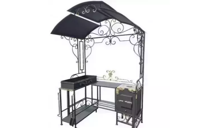 Комплект включает рабочий столик, на который можно разместить коптильню, придавая блюдам особый вкус. Под жаровней находится большая полка для хранения дров и посуды, а на боковых стенках можно удобно разместить аксессуары.