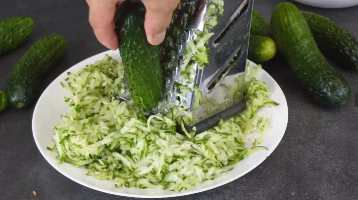 Первым делом необходимо тщательно подготовить овощи. Огурцы и морковь моются, крупные огурцы очищаются и натираются на крупной терке. Морковь также следует натереть. Лук нарезается кубиками, а болгарский перец очищается от семян и нарезается произвольно — он будет основой для пюре, созданного в мясорубке.