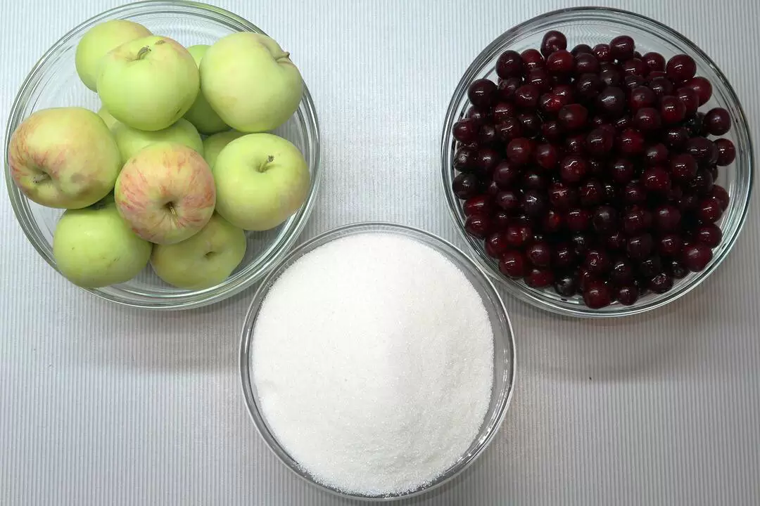 При выборе фруктов и ягод для компота стоит обратить внимание на их внешний вид: они должны быть свежими и аппетитными. Рекомендуется использовать плотные спелые яблоки и вишню, так как переспелые плоды могут развариться и испортить вид готового изделия. Все ингредиенты тщательно промываются, яблоки нарезаются на четвертинки, а сердцевина удаляется.
