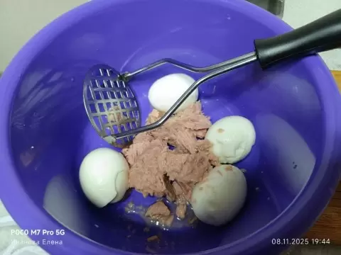 Когда времени немного, вареные яйца просто разомните толкушкой — еще быстрее и проще. Уверяю, в сочетании с тунцом это прекрасно!