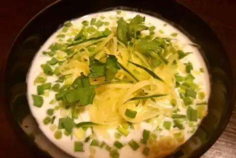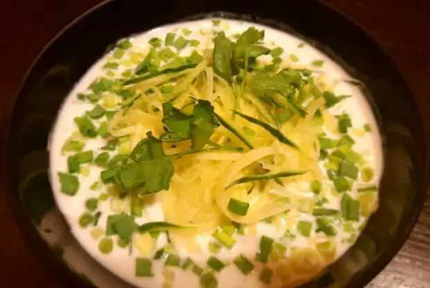 В отдельной миске смешайте кефир с измельченным зеленым луком и добавьте по вкусу специи. Это создаст основу для нашего холодника.