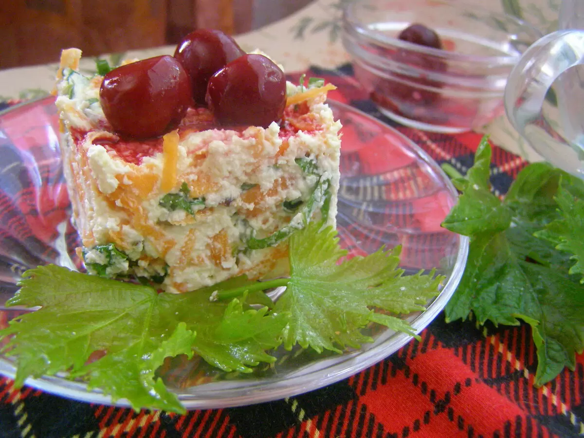 Что касается творога, здесь не стоит беспокоиться о жирности: он добавит салату нежности. Рекомендуется пропустить его через сито для лучшего смешивания. Фрукты и зелень также нужно нарезать — в этом рецепте виноградные листья придают особый шарм, даже если их оставить немного влажными.