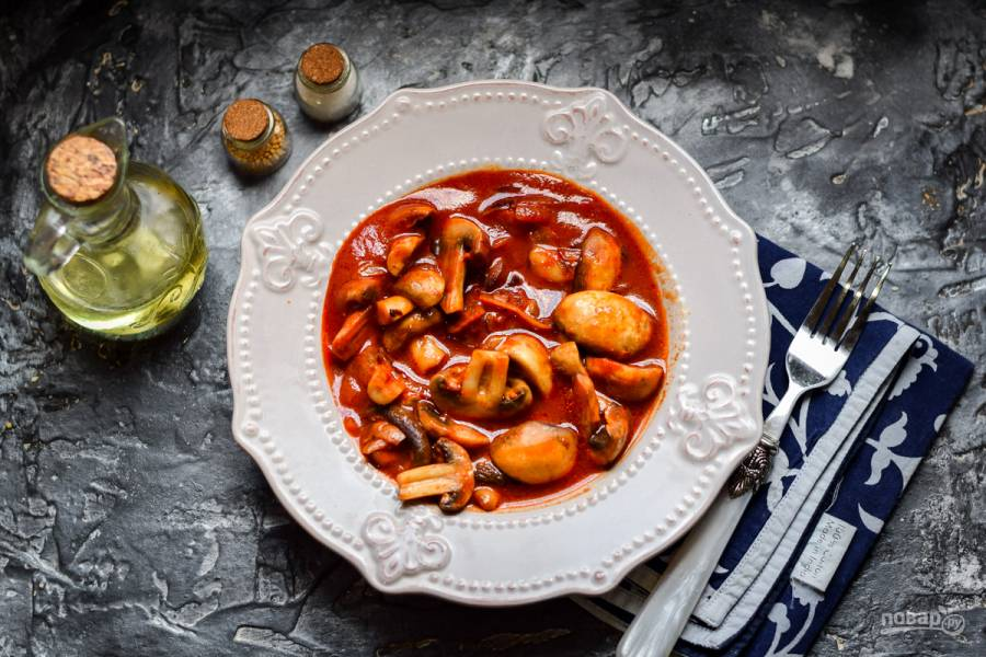 - Яркий вкус: Томатный соус добавляет кислой сладости и подчеркивает нежную текстуру грибов.