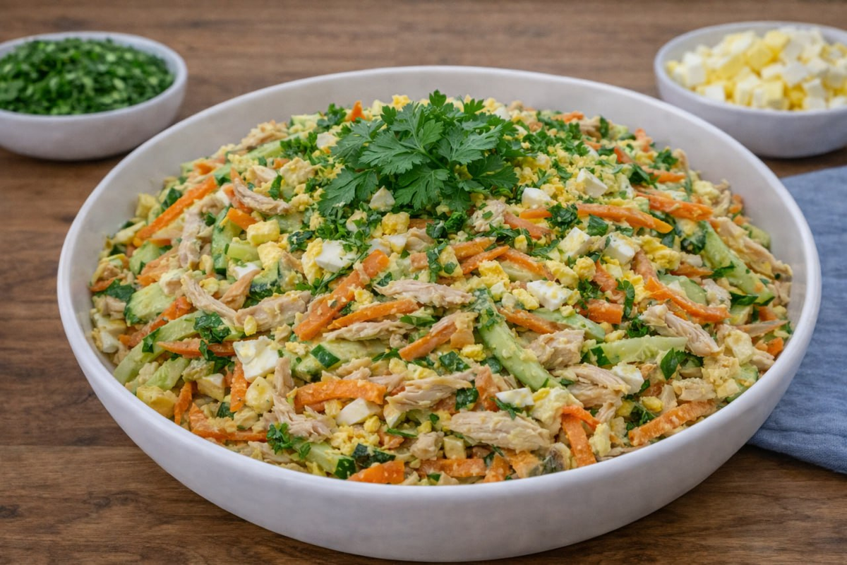Этот салат идеально подходит для тех моментов, когда хочется чего-то легкого, но сытного. Он выглядит просто, но его вкус продуман до мелочей. В составе: куриное филе, овощи, яйца и заправка на основе яичного желтка с горчицей и оливковым маслом. Ничего лишнего — всё на своих местах.