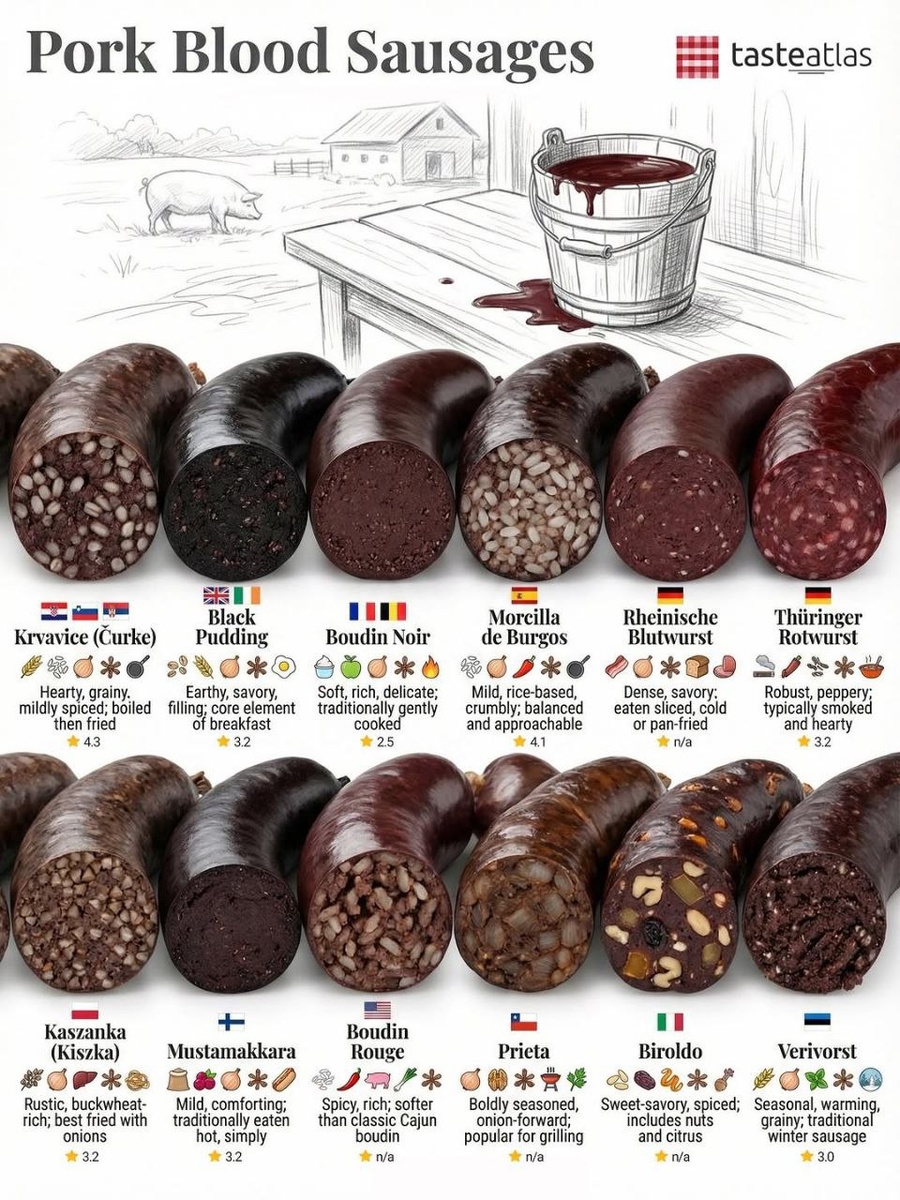 Кровяные колбасы – это истинное украшение гастрономического мира, относящееся к одним из самых древних видов колбас. Готовятся они путем смешивания крови животных с жиром, злаками, хлебом и приправами. Затем эта вкусная смесь аккуратно проваривается, чтобы достичь идеальной консистенции.